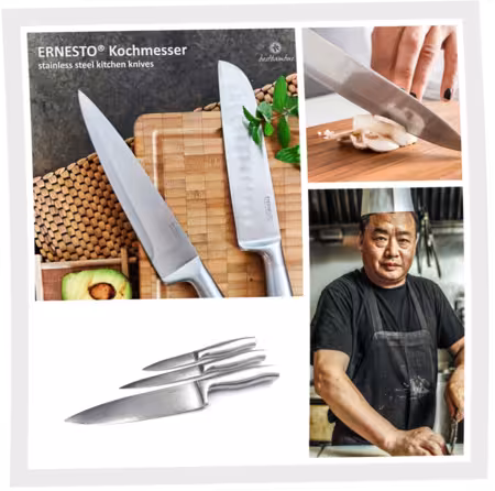Die Messer der deutschen Marke ERNESTO setzen auf robuste, rostfreie Edelstahlklingen. Antihaftbeschichtung und moderne Optik.