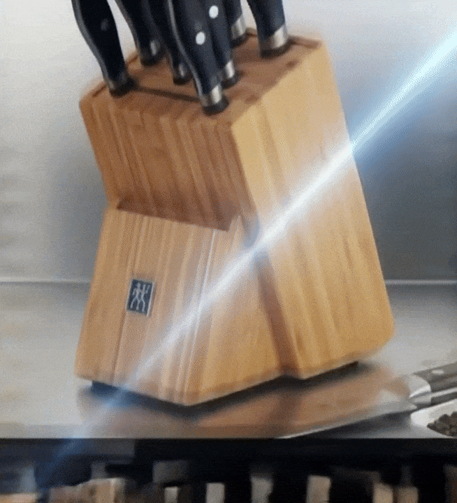Die im Holz eingelassenen Schlitze fixieren die Messer an ihrem Platz und sorgen jederzeit für einen schnellen Zugriff.