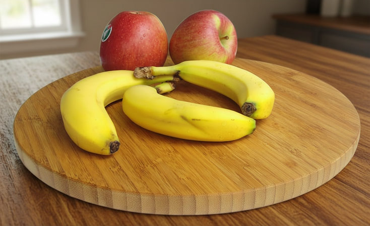 Die aus nachhaltigem Bambus Werkstoff gefertigte Platte lagert auf einem Drehteller mit Metall Kugellager.
