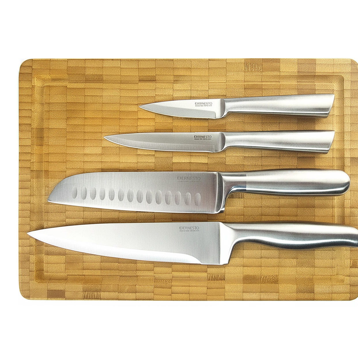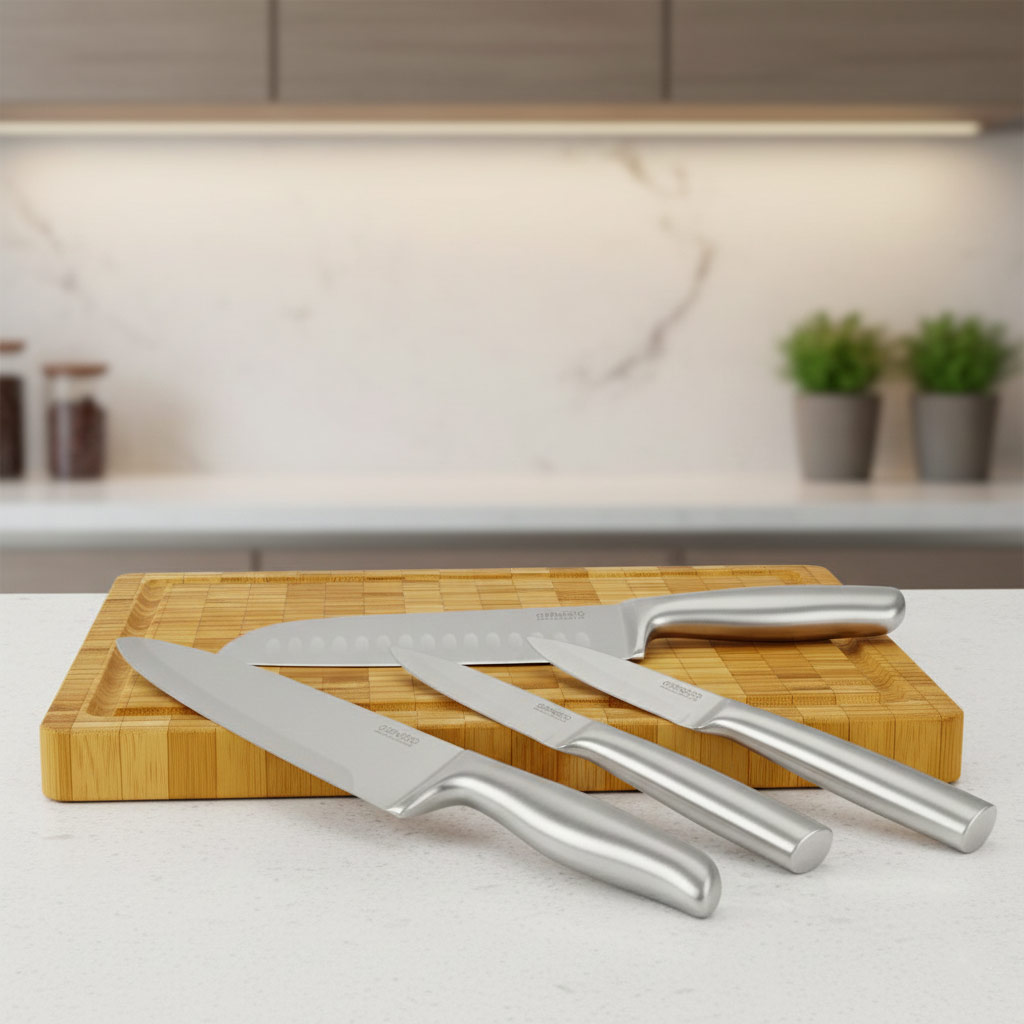 Lieferumfang: 5er Set mit 4 Messern+ 1 Schneidbrett