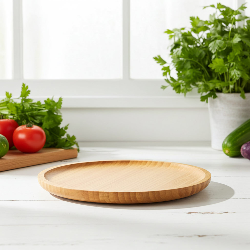 Rundes Serviertablett im Naturholz Dekor.