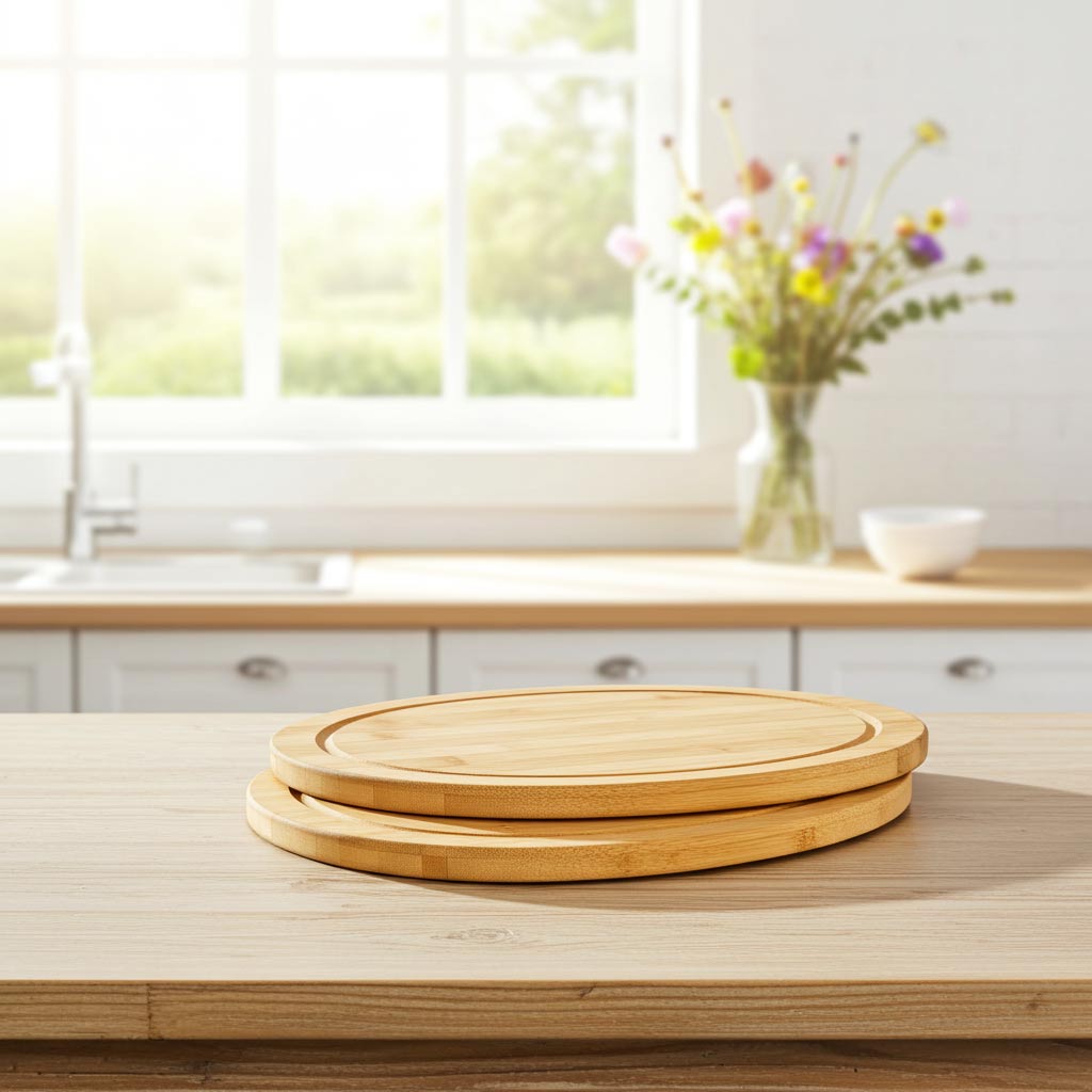 Frühstücksteller Familiengedeck bestehend aus 4 runden Bambus Brettchen mit eingelassener Tranchierrille.